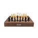The walnut inlaid board is more than just a playing surface—it offers integrated compartments that secure each piece while keeping them ready for display.