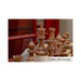 The chessmen are hand-carved from high-grade woods, carefully weighted for stability, and finished with billiard cloth bases that protect the board while allowing smooth movement.