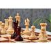 Its chessboard, carved from bud rosewood and boxwood keeps the playing field visually striking because of clean contrast and the rich grain of the woods.