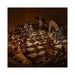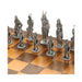 The game unfolds on a wooden chessboard inlaid with pewter marquetry, giving the entire set a premium, heirloom-quality presence that suits serious collectors, fans, and chess enthusiasts alike.